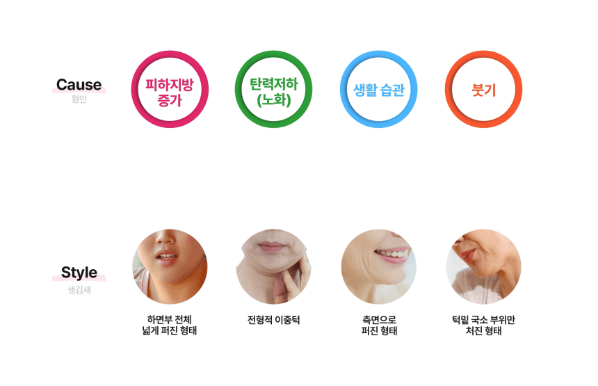 • Cause탄력 저하 + 턱 근육의 발달 + 피하지방층 증가